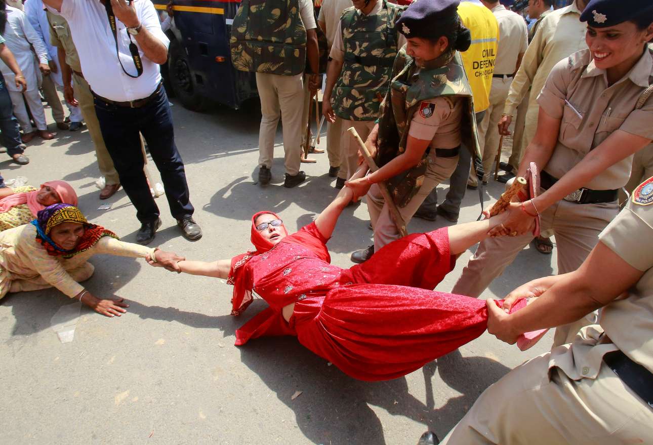 Σάββατο, 28 Απριλίου, Ινδία. Αστυνομικές δυνάμεις προσπαθούν να απομακρύνουν γυναίκες οι οποίες εμποδίζουν την κατεδάφιση παράνομων κτισμάτων στο χωριό Κούντα Αλί Σερ