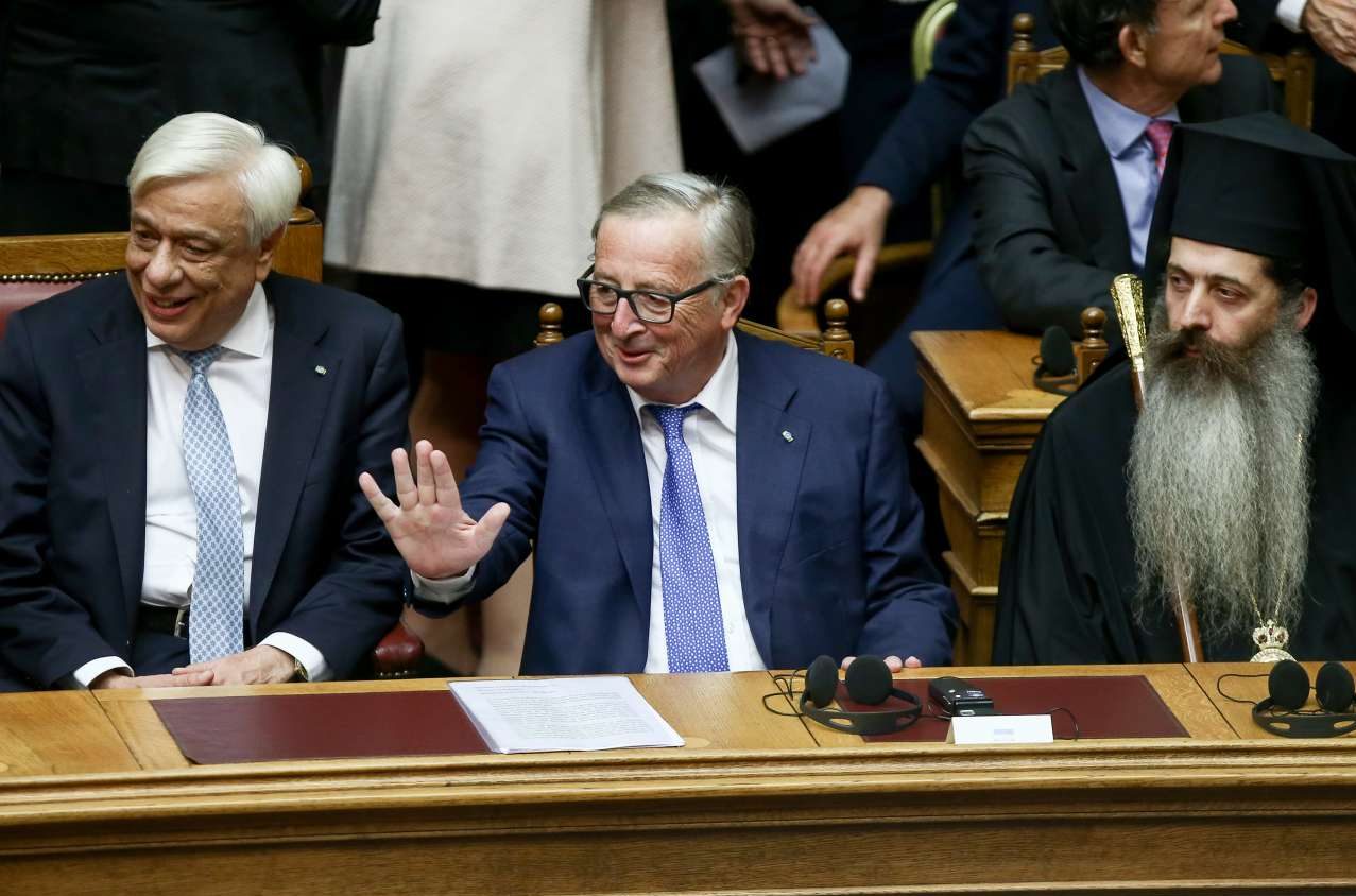 Πέμπτη, 26 Απριλίου, Ελλάδα. O Zαν Κλοντ Γιούνκερ περιχαρής στην ελληνική Βουλή ανάμεσα στον Πρόεδρο της Δημοκρατίας Προκόπη Παυλόπουλο και τον εκπρόσωπο τoυ Αρχιεπισκόπου, επίσκοπο Θεσπιών, Συμεών Βολιώτη