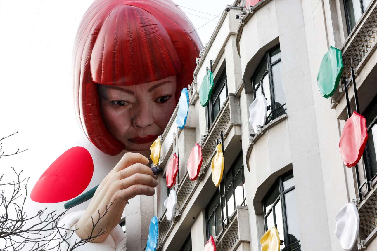 Υπερμέγεθες φουσκωτό ομοίωμα της γιαπωνέζας εικαστικού Γιαγόι Κουσάμα έχει γείρει πάνω στο κατάστημα της φίρμας ειδών πολυτελείας Louis Vuitton, στην πανάκριβη εμπορική λεωφόρο των Ηλυσίων Πεδίων, στο Παρίσι, και το στολίζει