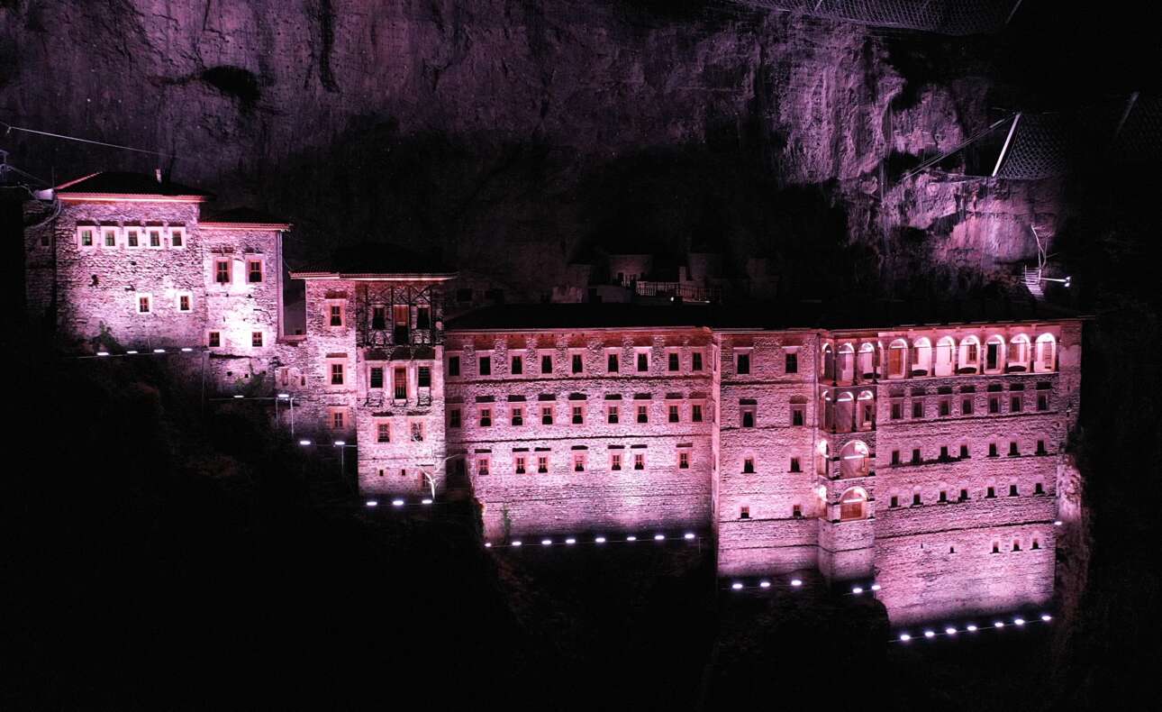 Η Παναγία Σουμελά, στην Τραπεζούντα, φωταγωγημένη με φούξια απόχρωση, κατά το φαντεζί γούστο του τουρκικού κράτους