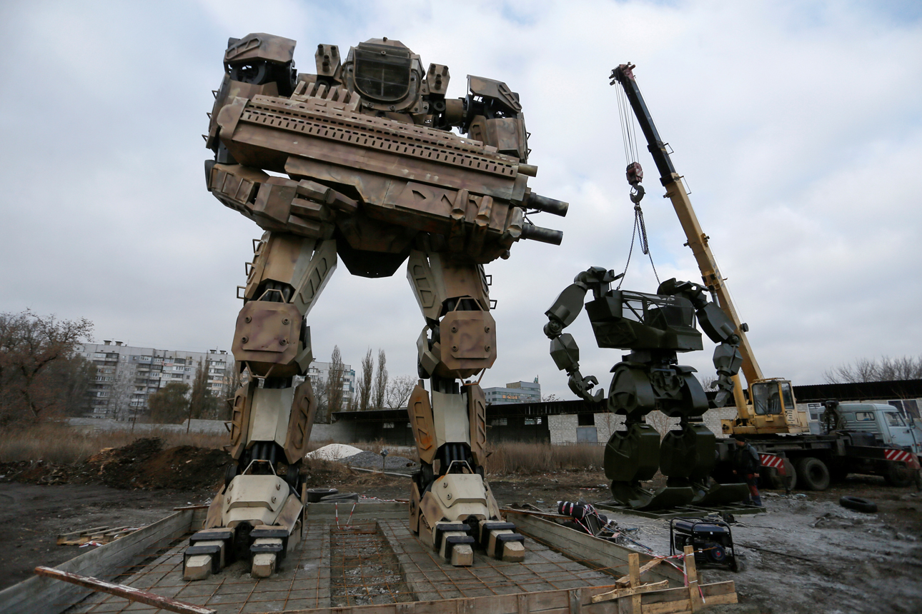 Στο Ντονέτσκ της Ουκρανίας (ή στο Ντονέτσκ της Λαϊκής Δημοκρατίας του Ντονέτσκ, ό,τι προτιμάτε) τα ρομποτικά τερατουργήματα δεν θα μπορούσαν παρά να θυμίζουν τον πόλεμο. Μάλιστα, δεν είναι παιχνίδι