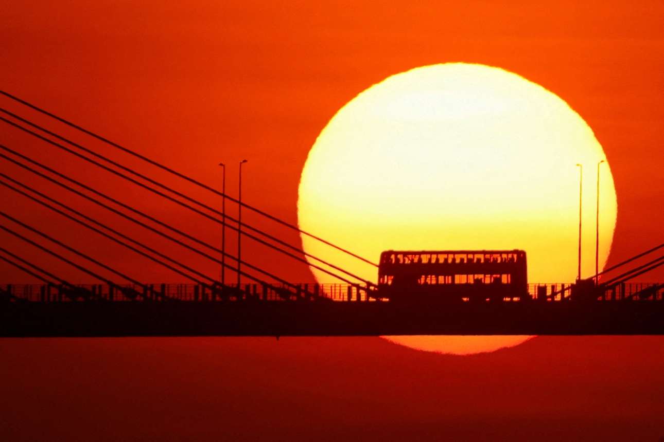 Θριαμβικές οι τελευταίες στιγμές του Ηλίου λίγο πριν από τη δύση του, στο Χονγκ Κονγκ – πάνω στη γέφυρα το διώροφο λεωφορείο (συγκοινωνιακό απολίθωμα της βρετανικής κατοχής) έχει γίνει κάρβουνο στη θράκα του πυρακτωμένου ορίζοντα