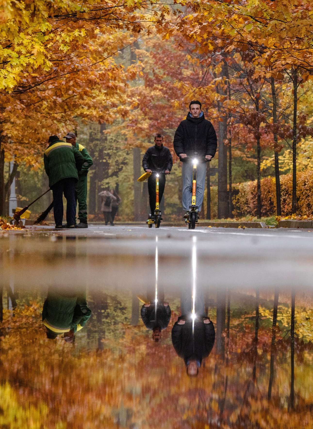 Τσέχοφ για τις κοπέλες στο βάθος, Γκόρκι για τους εργάτες, Μπουλγκάκοφ για τους νεαρούς με τα ηλεκτρικά σκούτερ – το αντικαθρέφτισμα όλων στα όμβρια του δρόμου είναι η όντως ρεαλιστική όψη του μοσχοβίτικου πάρκου, οπότε ασυζητητί Τολστόι για όλους