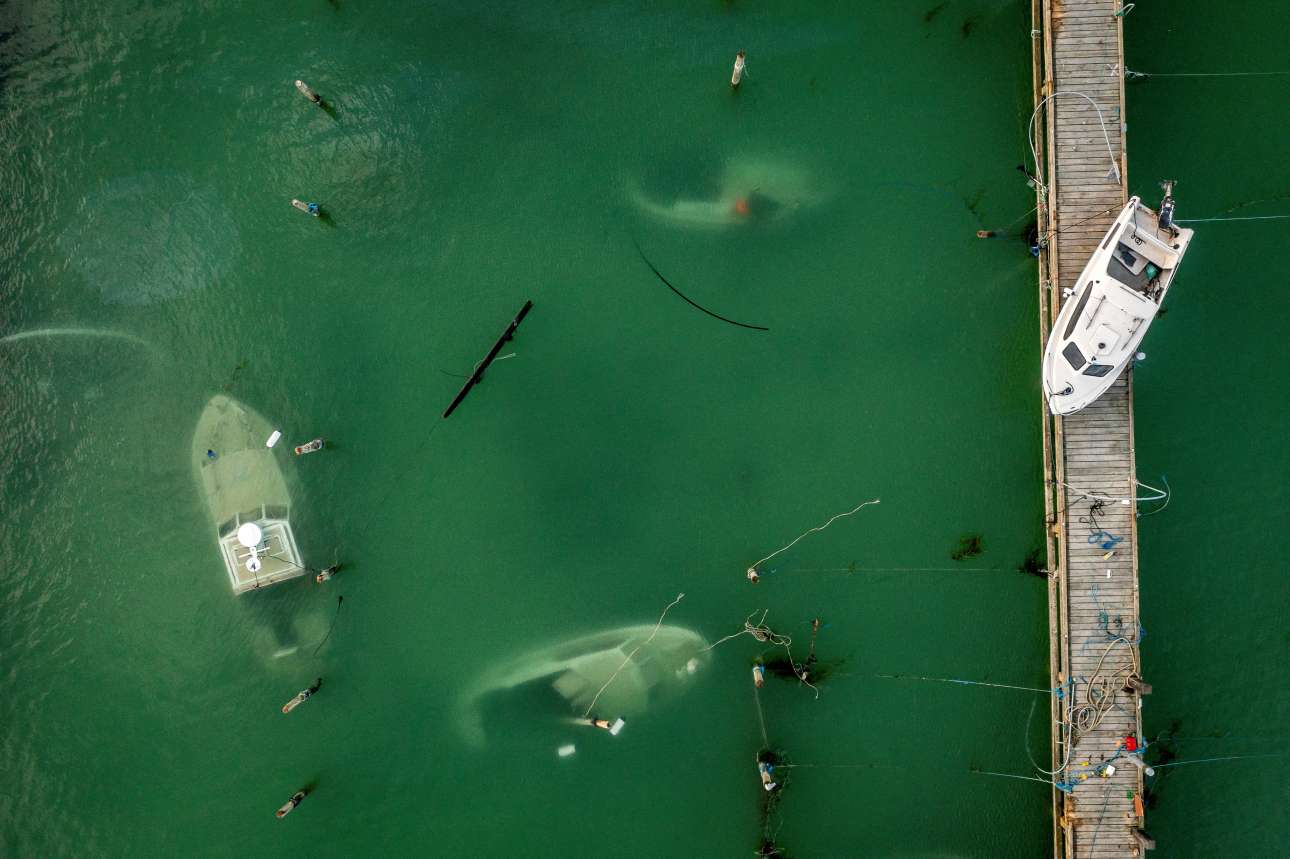 Το περασμένο Σαββατοκύριακο σφοδρή καταιγίδα πέρασε από αυτό το δανέζικο λιμανάκι και προξένησε τη βύθιση μερικών μικρών σκαφών – το καρέ, που τραβήχτηκε με drone δύο ημέρες μετά, δείχνει μέρος της καταστροφής