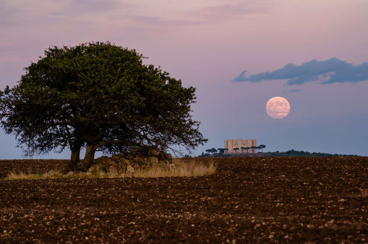 Την πανσέληνο του Οκτωβρίου τα ιταλικά media την ανέφεραν αμερικανικά «του κυνηγού» («luna piena del cacciatore»), αν και εφέτος ειδικά, που έπεσε στις 28 του μήνα, έπρεπε να τη βαφτίσουν «του τσολιά» – το καρέ τραβήχτηκε στο μεσαιωνικό Castel del Monte της Απουλίας