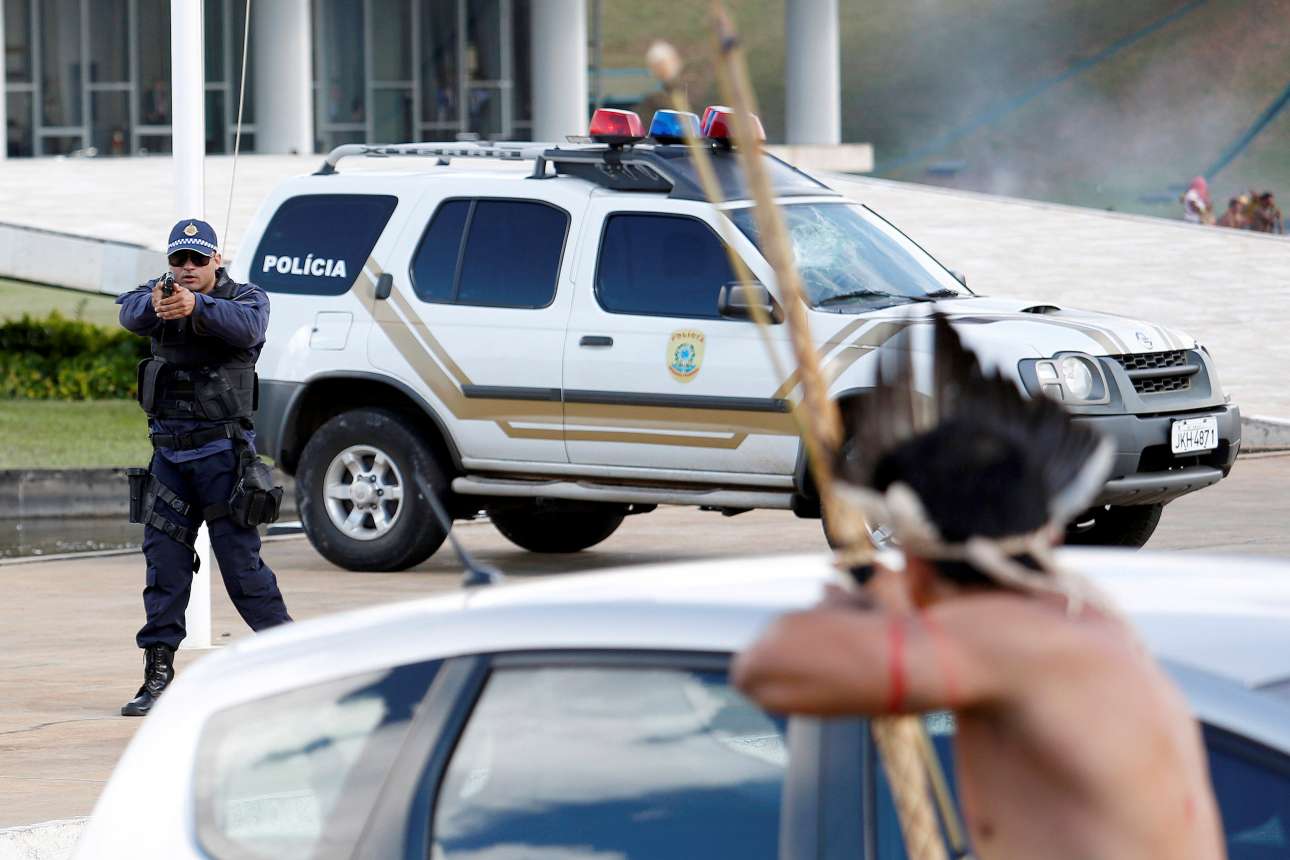 25 Απρ. Τόξο εναντίον πιστολιού. Στον 21ο αιώνα. Κατά τη διάρκεια αντικυβερνητικών διαδηλώσεων στην Μπραζίλια, όπου συμμετέχουν και οι Ινδιάνοι της Βραζιλίας διαμαρτυρόμενοι για την καταπάτηση των δικαιωμάτων των αυτόχθονων