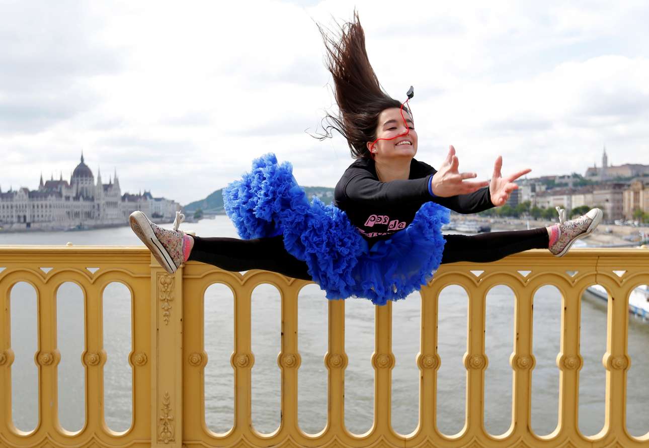 29 Απρ. Ενα κορίτσι, με μπλε τούλια και πολύχρωμα Allstar παπούτσια, χορεύει και υψώνεται σχεδόν πάνω από τη γέφυρα Μάργκαρετ, με φόντο την υπέροχη Βουδαπέστη, για να τιμήσει την Παγκόσμια Ημέρα Χορού