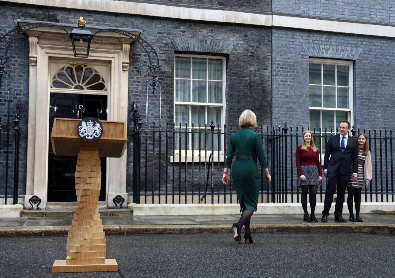 Η Λιζ Τρας αφού πέρασε την τελευταία ημέρα της ως ένοικος του ακινήτου επί της Ντάουνιγκ Στριτ 10 έστρεψε τα νώτα της στους φακούς και έσπευσε να ανταμώσει τον σύζυγό της και τα παιδιά της