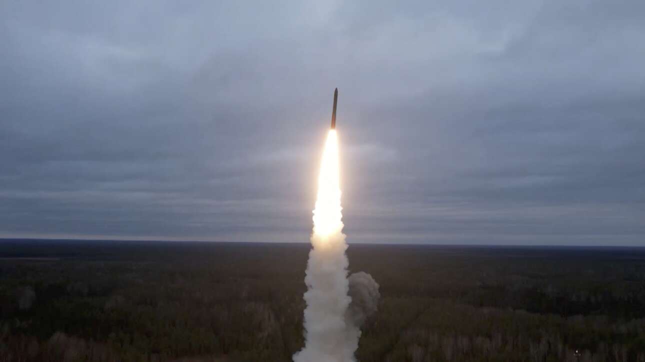 Εικόνα από βίντεο του ρωσικού υπουργείου Αμυνας δείχνει έναν διηπερωτικό πύραυλο που εκτοξεύθηκε κατά τη διάρκεια ασκήσεων πυρηνικού πολέμου