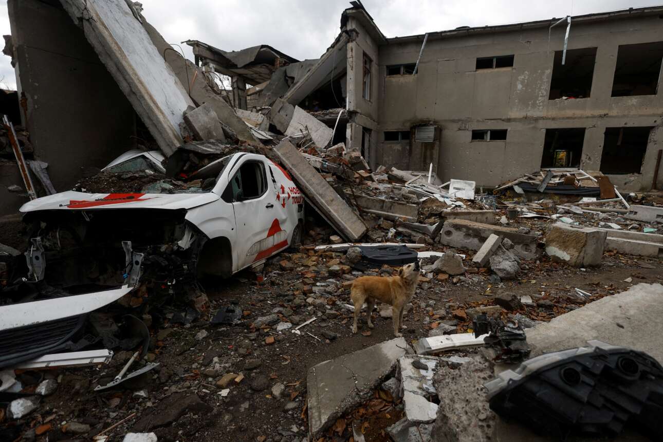 Σκύλος ουρλιάζει στο προαύλιο ενός βομβαρδισμένου σχολείου στην περιοχή Μικολάιφ