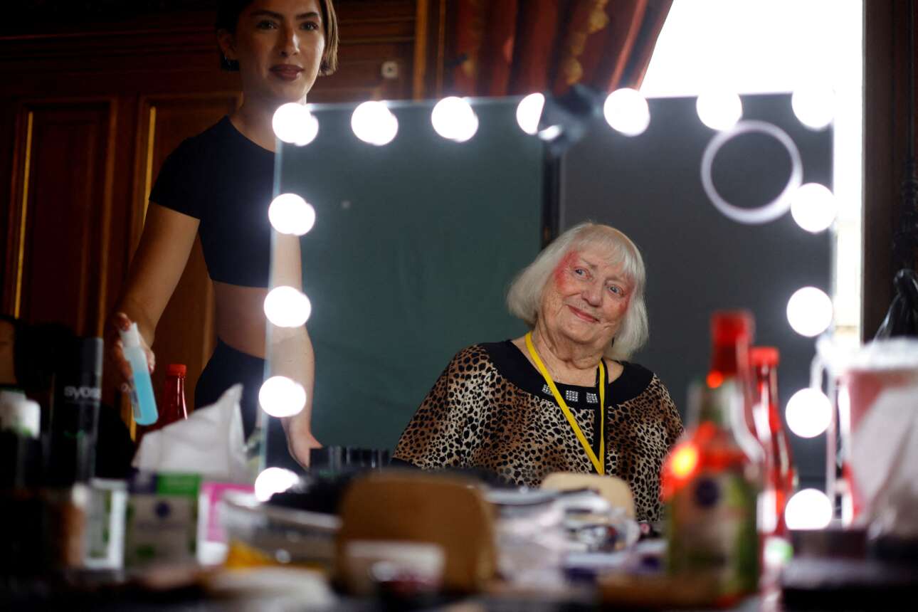 Στον καθρέφτη αντανακλάται το είδωλο του μανεκέν Ντέζι, 90 Μαΐων, ενώ τον φακό αντιμετωπίζει απευθείας, με την τόλμη της νιότης, η μακιγιέζ: καρέ παρασκηνίου από επίδειξη ρούχων για ηλικιωμένες, τα οποία σχεδίασαν φοιτητές γαλλικών σχολών μόδας