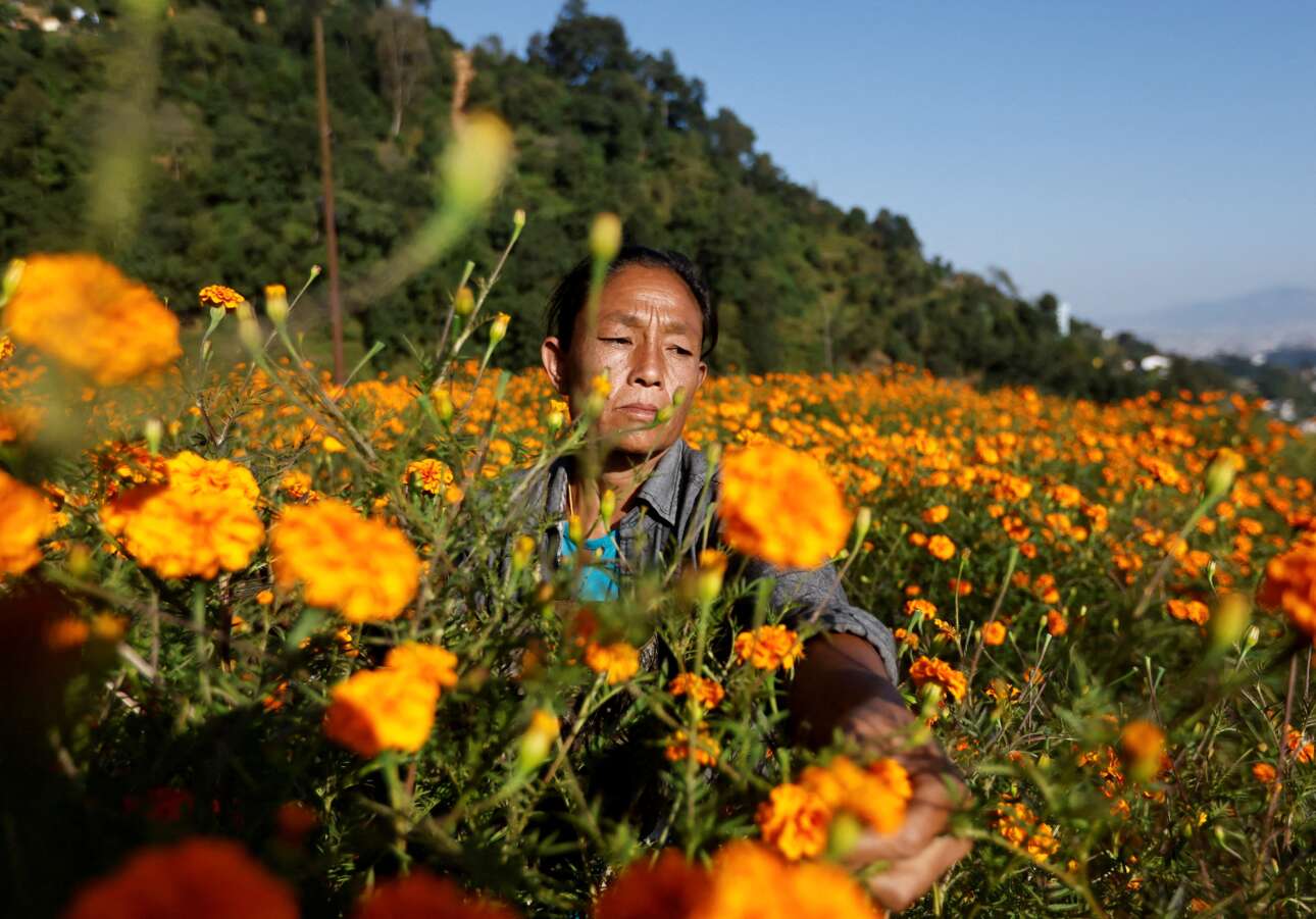 Εν όψει λατρευτικού φεστιβάλ στο Κατμαντού η νεπαλέζα αγρότισσα μαζεύει λουλούδια από τους μπαξέδες για να πλέξει γιρλάντες και στεφάνια και να τα μοσχοπουλήσει