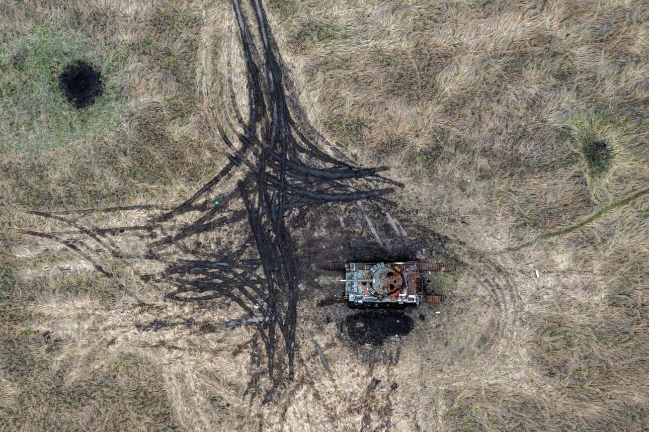 Δεν βλέπετε «αφηρημένο» πίνακα του Βασίλη Καντίνσκι, του μετρ της Ρωσικής Πρωτοπορίας, αλλά ουκρανικό χωράφι: οι «κύκλοι» επάνω του είναι κρατήρες που άνοιξαν τα πυρά Πυροβολικού, ενώ οι «γραμμές» δείχνουν τις επιθανάτιες κινήσεις του τανκ