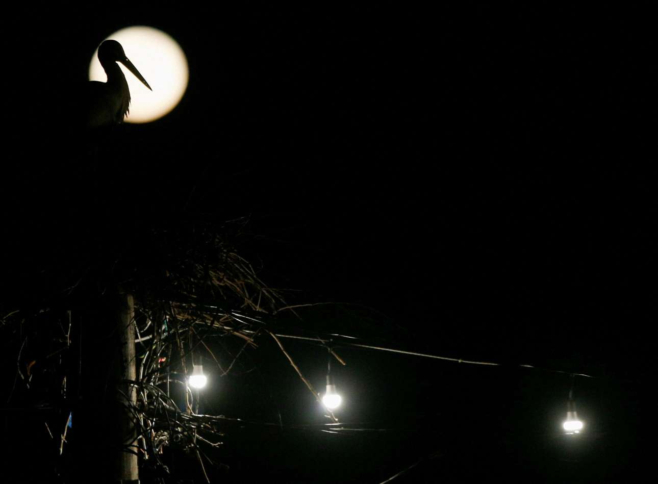 Ο σκοπιανός καλλιτέχνης έμαθε ότι την πανσέληνο του Μαρτίου οι Αμερικανοί τη λένε «του σκουληκιού», έτσι έψαξε να βρει σκωληκοφάγο πελαργό για την απαθανάτισή της – δεν τα πήγε και άσχημα, παρά το στυλιζάρισμα με τους γλόμπους-φεγγαράκια