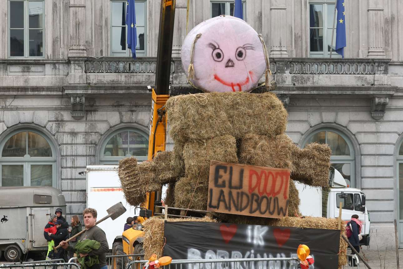 Σαν αιμοδιψές τέρας που «σκοτώνει τη γεωργία» βλέπουν οι φλαμανδοί αγρότες την «πράσινη» Ευρωπαϊκή Ενωση – στιγμιότυπο από δυναμική διαδήλωση βέλγων παραγωγών που έγινε στις Βρυξέλλες