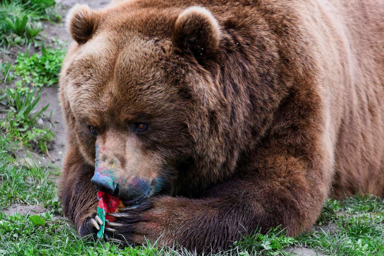 Καφέ αρκούδα της Χερσονήσου Καμτσάκα –δηλαδή Ρωσίδα της Απω Ανατολής–, παρεπιδημούσα στον ζωολογικό κήπο του Γκελζενκίρχεν της Γερμανίας, άρτι αφυπνισθείσα λόγω έαρος, απολαμβάνει «σνακ της Λαμπρής» (που ξεβάφουν όμως)