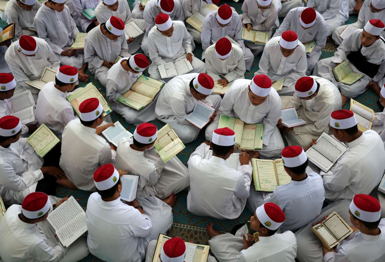 Μαθητές ισλαμικού ιεροδιδασκαλείου στην Κουάλα Λουμπούρ της Μαλαισίας μελέτησαν ομαδικώς το Κοράνι κατά τη –σημαδιακή για αυτούς– 17η ημέρα του Ραμαζανίου