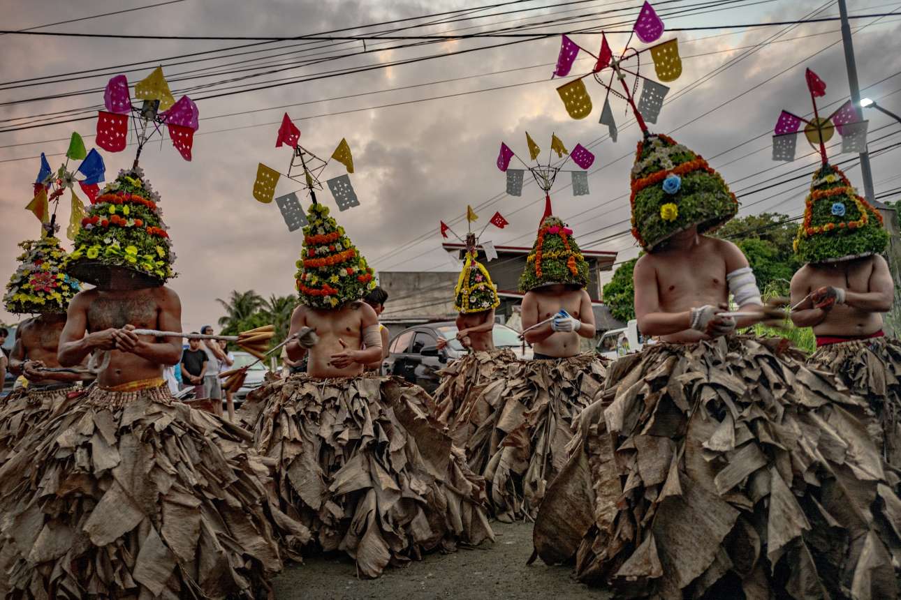 Παρέλαση ημίγυμνων αυτομαστιγουμένων που φορούν φούστες από αποξηραμένα φύλλα μπανανιάς και ανθοστόλιστες περικεφαλαίες κοσμημένες με Σταυρούς – Μεγάλη Παρασκευή των καθολικών στις Φιλιππίνες