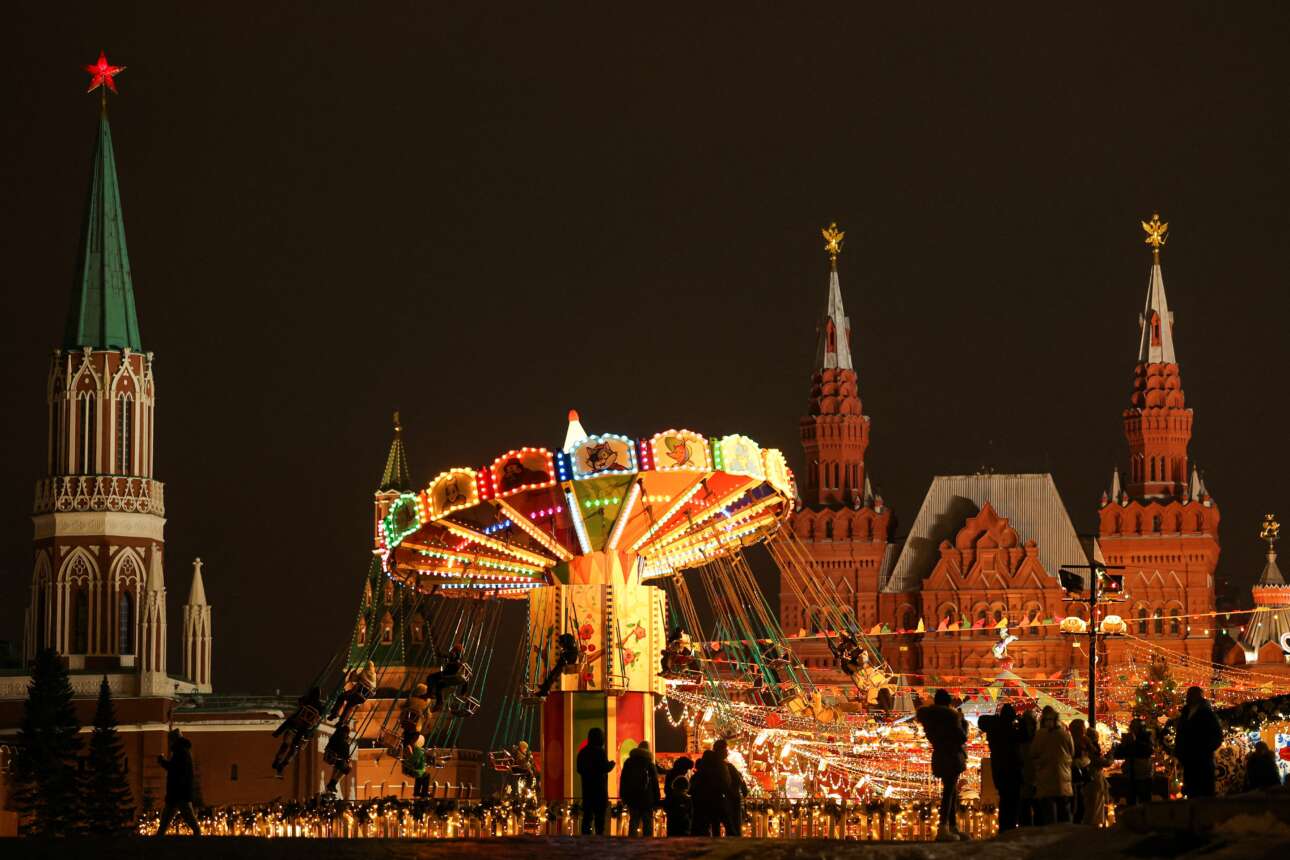 Τα παιδάκια στροβιλίζονται στις κούνιες και στα καρουσέλ και οι μεγάλοι κάνουν βόλτες και κουβεντιάζουν – γιορτινό καρέ της 26ης Δεκεμβρίου από τη μοσχοβίτικη Κόκκινη Πλατεία, όπου λειτουργεί «χριστουγεννιάτικη αγορά», μαγνήτης μικρών και μεγάλων