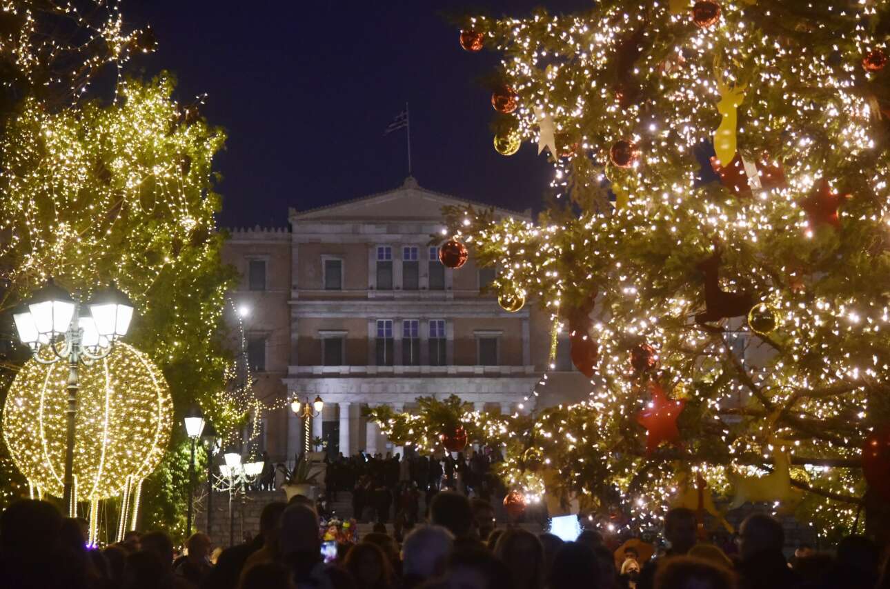 Πολλές οικογένειες Αθηναίων συνέρρευσαν στη στολισμένη πλατεία Συντάγματος την επομένη των Χριστουγέννων, καθώς ο καιρός ήταν γλυκός ακόμη και το βράδυ – καρέ προσανατολισμένο, πάντως, στη Βουλή