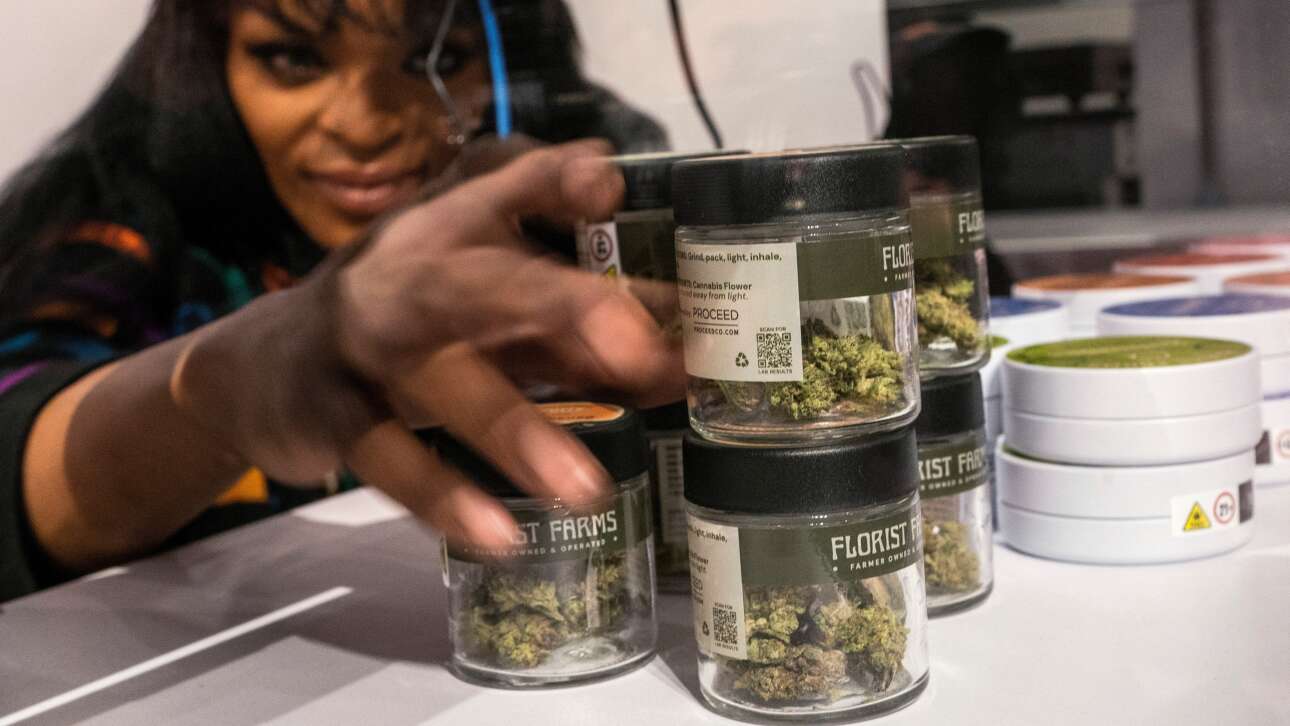 Η υπάλληλος του καταστήματος στο Ιστ Βίλατζ του Μανχάταν τοποθετεί στο ράφι βαζάκια με «χόρτο»: το πρώτο νεοϋορκέζικο καθ' όλα νόμιμο πωλητήριο μαριχουάνας για ψυχαγωγική χρήση είναι γεγονός