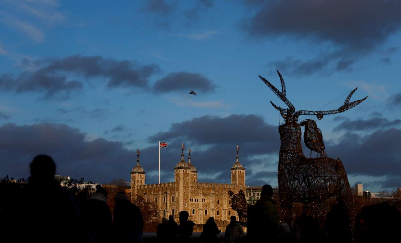 Απογευματινή περιδιάβαση πλήθους δίπλα στον ηλιόλουστο Πύργο του Λονδίνου στο μεσοδιάστημα των εορτών. Ο κόσμος βγήκε να πάρει τον αέρα του λίγο προτού ανάψουν τα λαμπάκια στα χριστουγεννιάτικα στολίδια