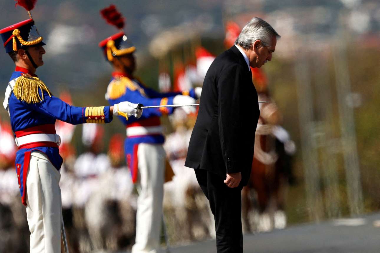 Ο πρόεδρος της Αργεντινής Αλμπέρτο Φερνάντεζ δείχνει έτοιμος να σωριαστεί άπνους, τρυπημένος πέρα ως πέρα από το ξίφος του αξιωματικού της βραζιλιάνικης προεδρικής φρουράς – δεν πρόκειται για ποδοσφαιρικό χουλιγκανισμό: ο φακός μετέτρεψε τη φιλόφρονα υπόκλιση (στις σημαίες) σε έγκλημα κοινής θέας