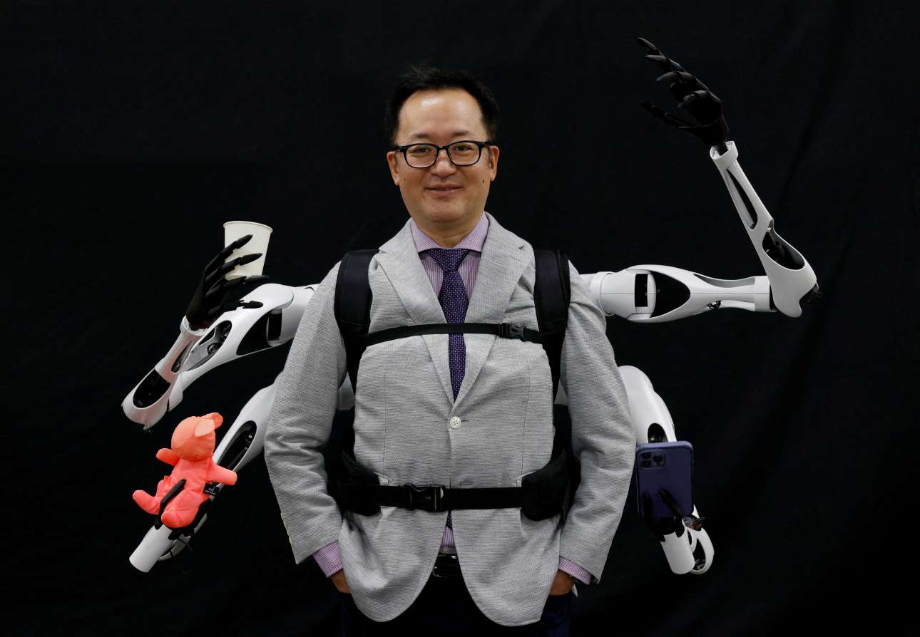 Τέσσερα ρομποτικά χέρια ξεφυτρώνουν από την πλάτη του ιάπωνα πανεπιστημιακού Μασάικο Ινάμι: ένα κρατάει τον «φρέντο», το άλλο κινητό, το τρίτο το ευαίσθητο ένα τυφλό λούτρινο και το τελευταίο μένει ελεύθερο για ό,τι ήθελε προκύψει (από χαιρετούρα μέχρι φάσκελο και βαθιά βουτιά σε ξένη τσέπη)