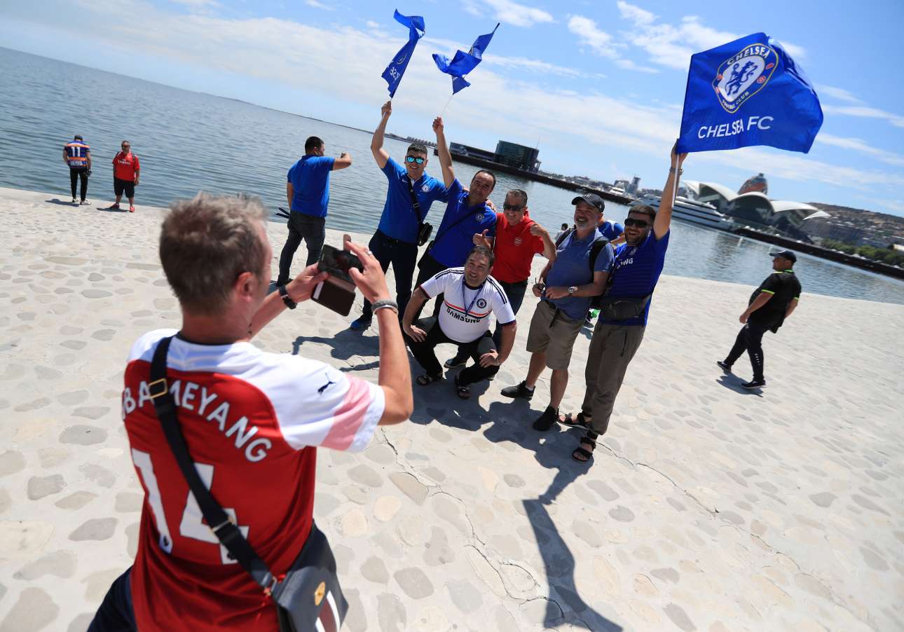 Φίλαθλος της Άρσεναλ βγάζει φωτογραφία τους αντίστοιχους της Τσέλσι, σ' ένα δείγμα ποδοσφαιρικού πολιτισμού, με φόντο την Κασπία Θάλασσα στο Μπακού του Αζερμπαϊτζάν. Ο μεγάλος τελικός του Europa League πραγματοποιήθηκε την Πέμπτη
