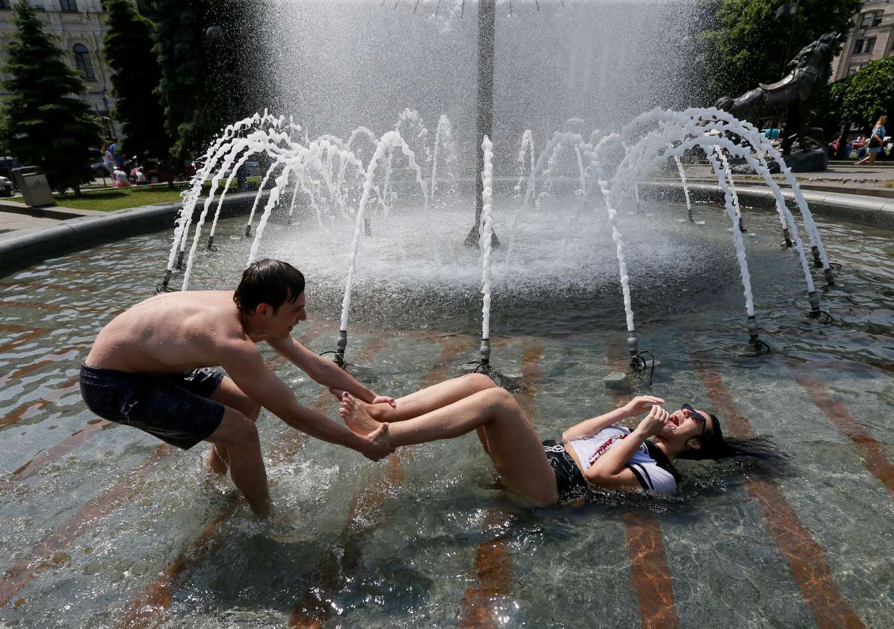 Μαθητές διασκεδάζουν το τέλος της σχολικής περιόδου σε συντριβάνι στο κέντρο του Κιέβου