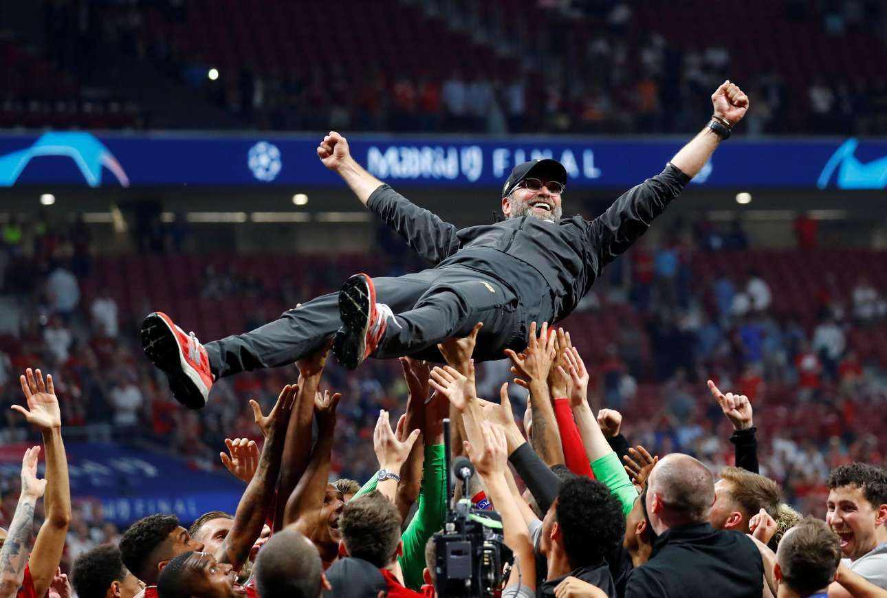 Οι παίκτες της Λίβερπουλ σηκώνουν στα χέρια τον σπουδαίο προπονητή τους Γιούργκεν Κλοπ, μετά την κατάκτηση του Champions League χθες βράδυ στην Μαδρίτη, με αντίπαλο την Τότεναμ