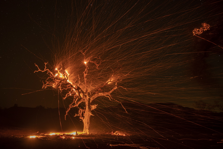 Η φλεγομένη βελανιδιά στην Καλιφόρνια είναι συναρπαστική εικόνα για τον φακό μέσα στον άνεμο που λυσσομανά, όμως τα 75.000 στρέμματα καμένης γης είναι καταστροφή τεράστια