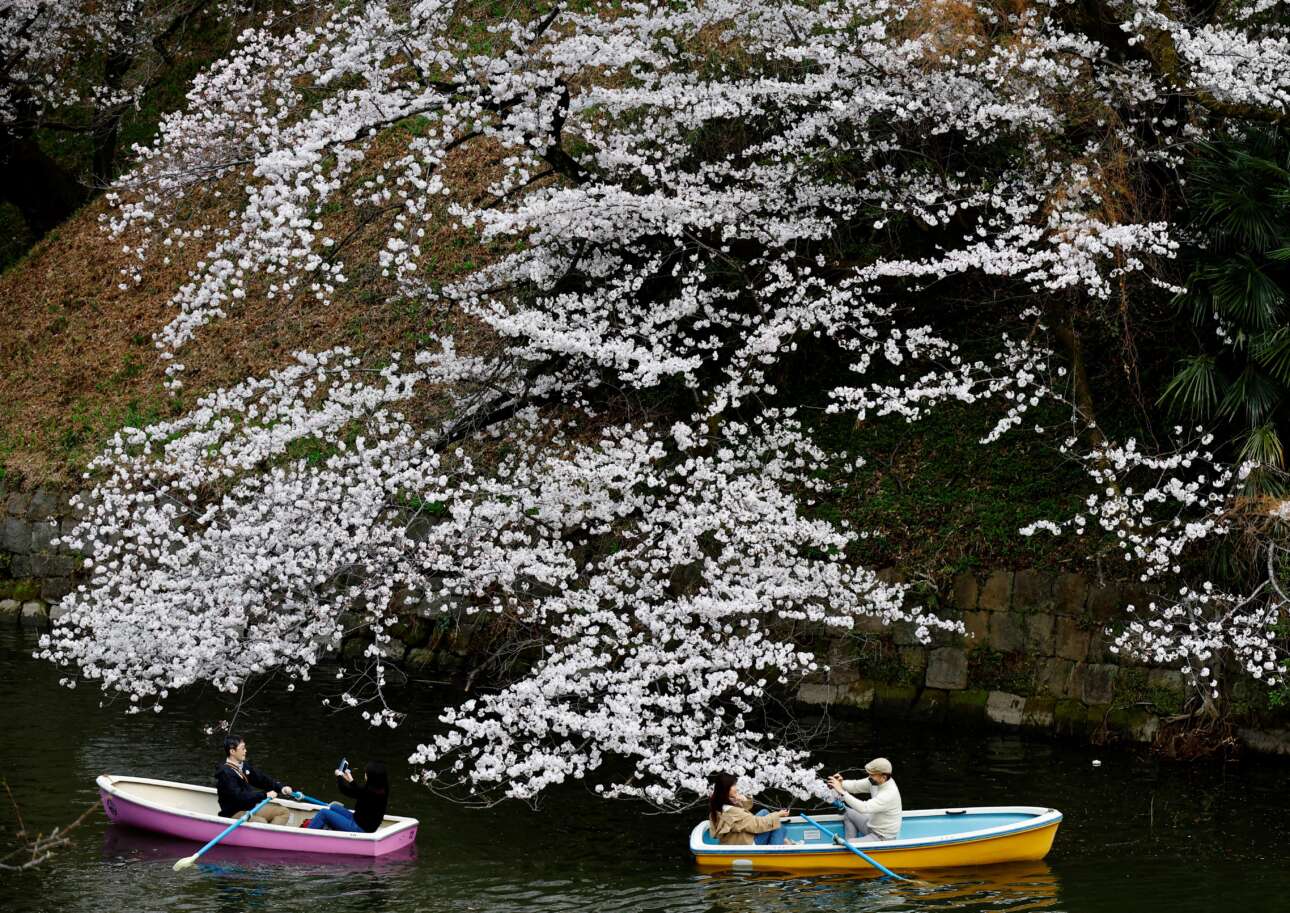 Ειδυλλιακό στιγμιότυπο από βαρκάδα ερωτοχτυπημένων Ιαπώνων σε ένα πάρκο του Τόκιο – τον εαρινό έρωτα των δύο ζευγαριών του ενσταντανέ φουντώνει και σκέπει η ολάνθιστη κερασιά γέρνοντας τα κλωνάρια της μέχρι το σκοτεινό νερό της ήσυχης λίμνης