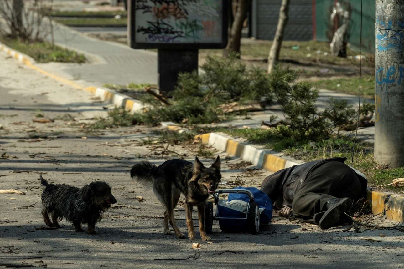 Βαθιά τρομαχτική σκηνή από το κατεστραμμένο Ιπρίν: πτώμα αμάχου κείται στην άκρη του δρόμου και δίπλα του περνούν δύο σκύλοι, πρώην κατοικίδια και νυν κυνηγοί, ψάχνοντας κάτι για να ξεγελάσουν την πείνα τους – δίπλα στον σκοτωμένο άνδρα τα ζώα τα οδήγησε η τσάντα για τα ψώνια την οποία κουβαλούσε τη στιγμή που δέχθηκε τα πυρά