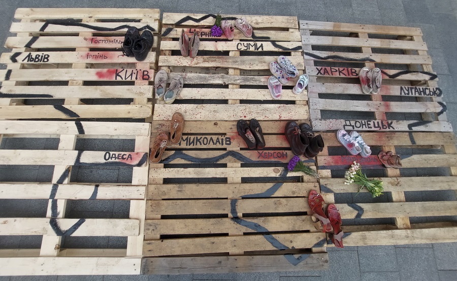 Παλέτες με ζωγραφισμένο τον χάρτη της Ουκρανίας και με καρφωμένα στα σανίδια παπούτσια: πρόκειται για κατασκευή που χρησιμοποιήθηκε στην παράσταση δρόμου «Δεν θα συνηθίσουμε τον πόλεμο», η οποία δόθηκε στο Λβιβ στις 29 Μαρτίου – τα ακούνητα υποδήματα συμβολίζουν την αδυναμία εξόδου των αμάχων από τις κατοικίες τους