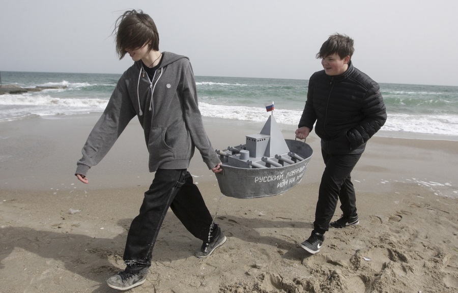Την Πρωταπριλιά οι κάτοικοι της Οδησσού γιόρτασαν την «Ημέρα του Χιούμορ»: εδώ βλέπετε δύο παιδιά στην παραλία να κρατούν ένα «ρωσικό πολεμικό πλοίο» – πάνω του έχουν γράψει τα ακατανόμαστα