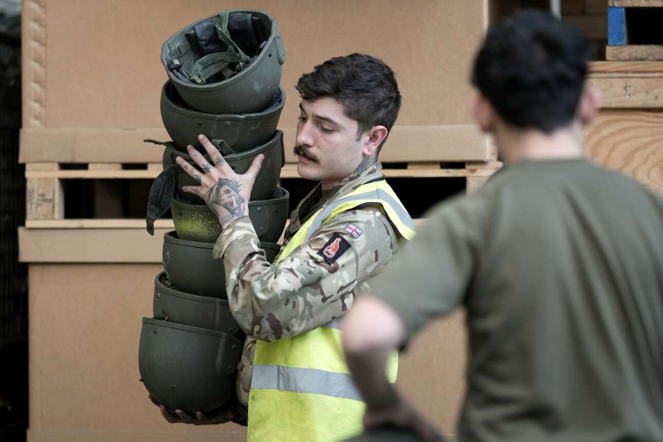 Βρετανός στρατιώτης, που παρά τα έξτρα τατουάζ μοιάζει κάπως με τον αξέχαστο τραγουδιστή Φρέντι Μέρκιουρι, μεταφέρει κράνη: καθημερινώς χιλιάδες βρετανικά κράνη συσκευάζονται σε κούτες και στέλνονται στην Ουκρανία
