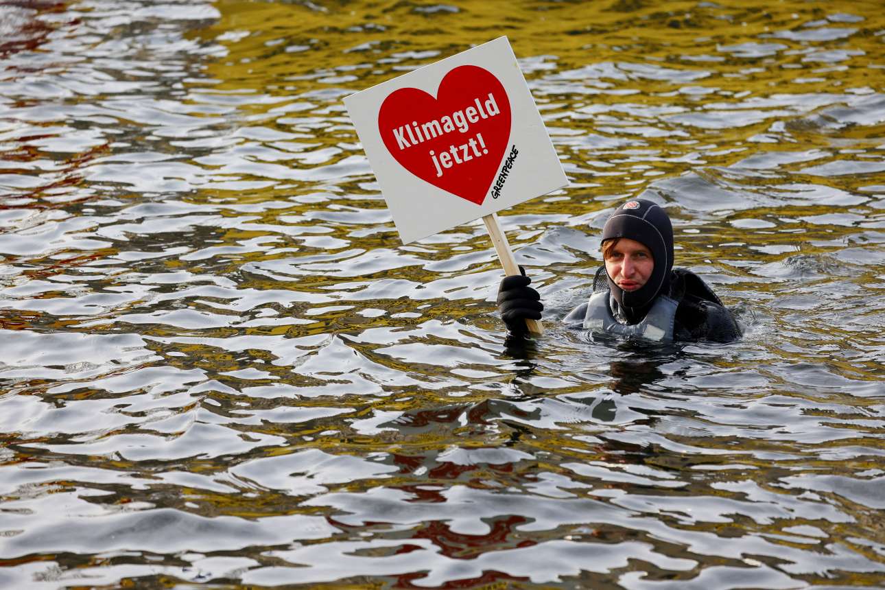Οικολόγος της Greenpeace βούτηξε στον ποταμό Σπρε κρατώντας πλακάτ με το σύνθημα «Λεφτά για το κλίμα!» ενόσω η γερμανική Βουλή ήταν απασχολημένη (ακόμη) με τον Προϋπολογισμό
