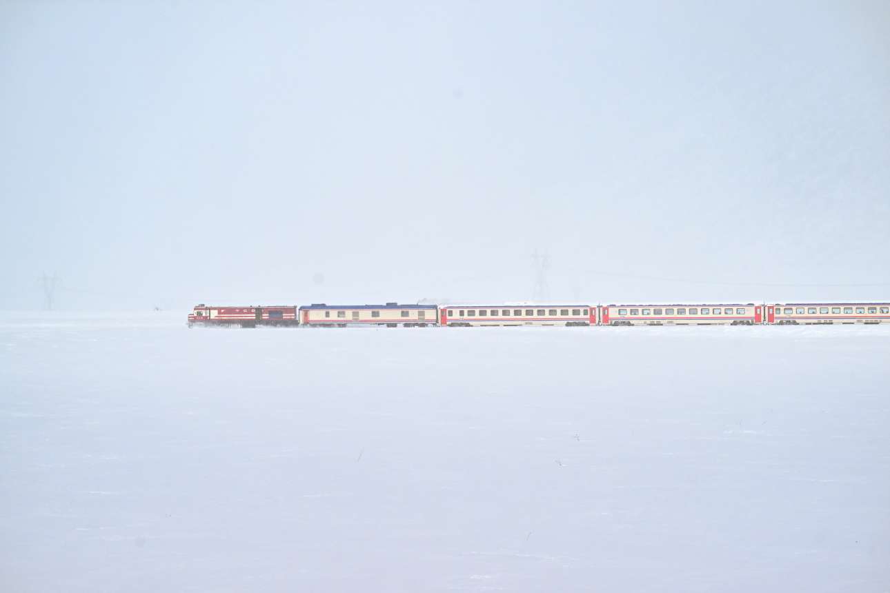 Με το ελάχιστο κρεμ, μπλε και κόκκινό του, το τρένο διέρρηξε το πυκνό πέπλο του λευκού σε χιονισμένη περιοχή κοντά στη λίμνη Βαν, στην Τουρκία