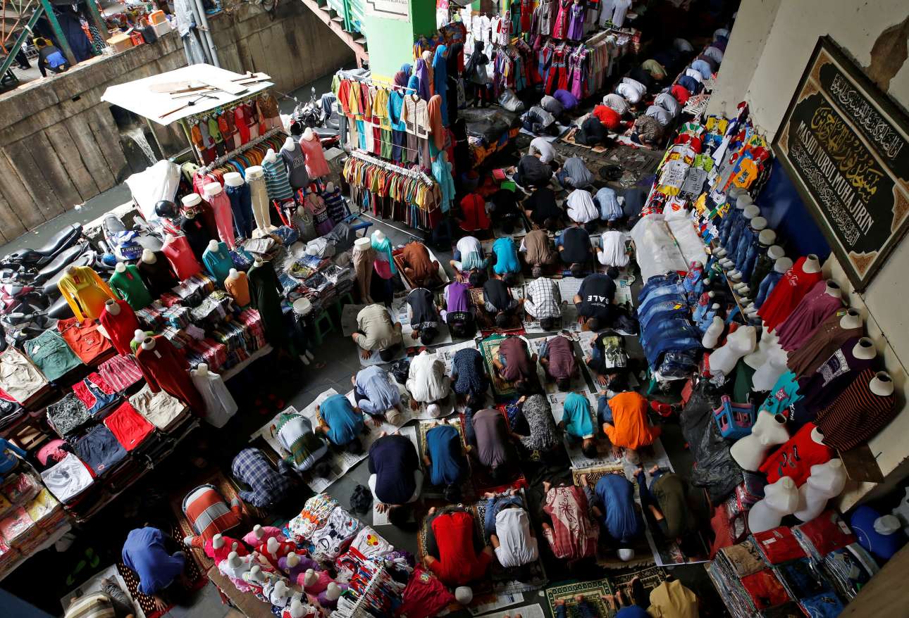 2 Ιουν. Εργαζόμενοι σε καταστήματα και εργοστάσια ενός δρόμου στην αγορά υφασμάτων Tanah Abang, στο κέντρο της Τζακάρτα, έκαναν ένα διάλειμμα, μπλέχτηκαν ανάμεσα στα πολύχρωμα ρούχα και γονάτισαν για την καθιερωμένη προσευχή, στο πλαίσιο του ιερού μήνα του Ραμαζανιού
