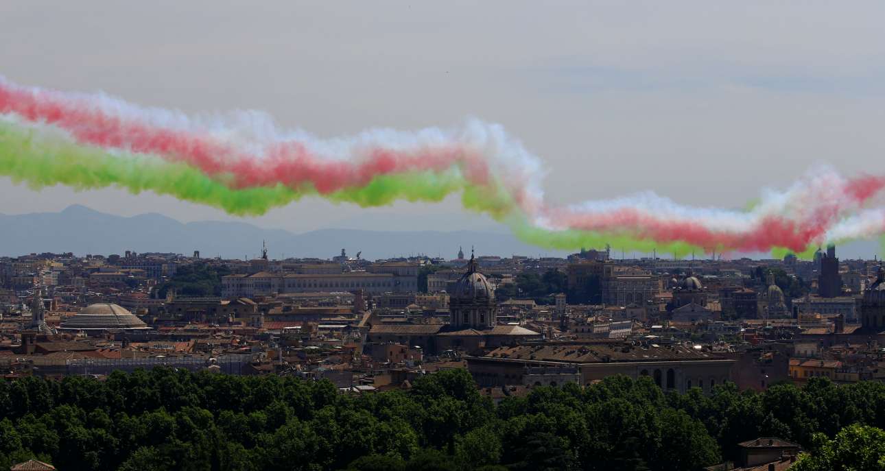 2 Ιουν. Πολύχρωμοι καπνοί απλώνονται πάνω από την ιταλική πρωτεύουσα κατά τη διάρκεια στρατιωτικής παρέλασης για την Ημέρα της Δημοκρατίας στη Ρώμη