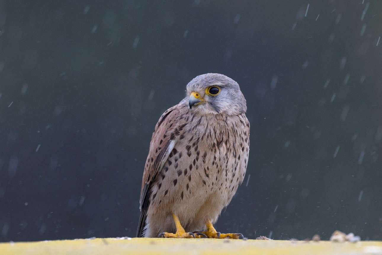 Αραβικό γεράκι, πολύ σοβαρό, στάθηκε σε ένα τοιχίο στα σύνορα Γάζας-Ισραήλ και επόπτευσε την Παλαιστίνη, σίγουρο για το πού έπρεπε να πετάξει – και κατά κει πέταξε