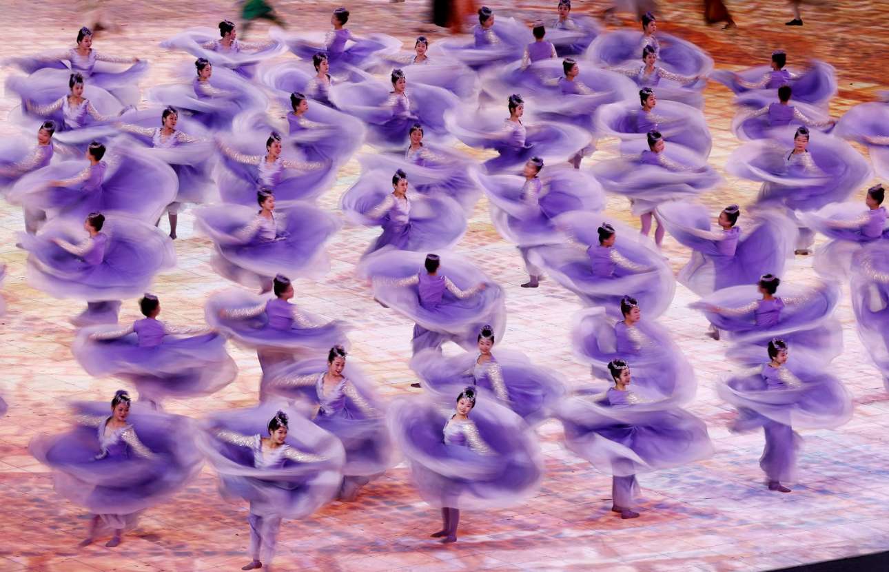 Στροβιλισμοί χορευτριών στην έναρξη των Ασιατικών Χειμερινών Αγώνων, μίτινγκ που διεξάγεται στο Χαρμπίν της Μαντζουρίας – πανδαισία του λιλά, που την απόλαυσε και ο πρόεδρος Σι αυτοπροσώπως