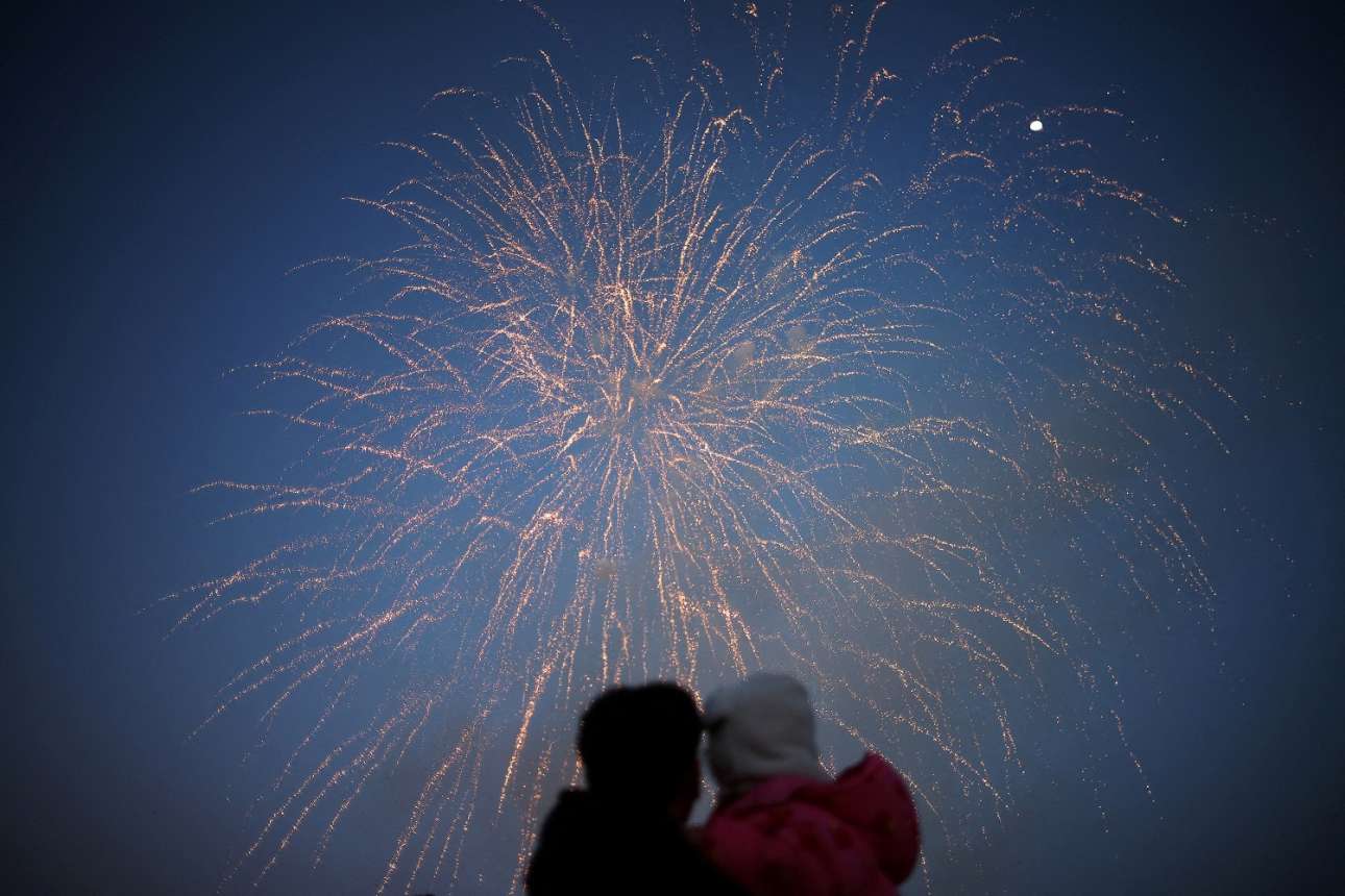 Πατέρας και κόρη χάζεψαν αγκαλιά τα βεγγαλικά που βιάστηκαν να καλωσορίσουν την πανσέληνο του Φεβρουαρίου – διότι στη Νότια Κορέα την έχουν για σπουδαίο πράμα