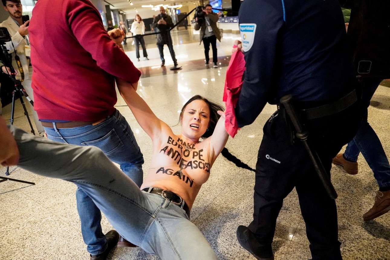 Oι ισπανοί χωροφύλακες έσυραν την κοπέλα στα πατώματα επειδή φώναξε «Ο φασισμός δεν θα περάσει!» σε κάποια σύναξη ακροδεξιών – ήταν μέλος της ημίγυμνης ομάδας FEMEN