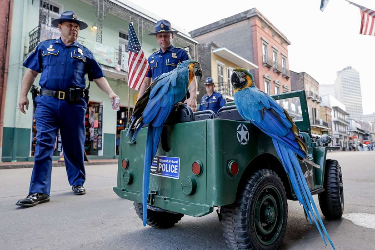 Αφού το αμαξάκι τους διαλαλούσε ότι «στηρίζει την τοπική αστυνομία», οι μπλε παπαγάλοι δεν συνελήφθησαν για αντιποίηση αρχής – καρέ από περιπολία στη φημισμένη Μπέρμπον Στριτ της Νέας Ορλεάνης