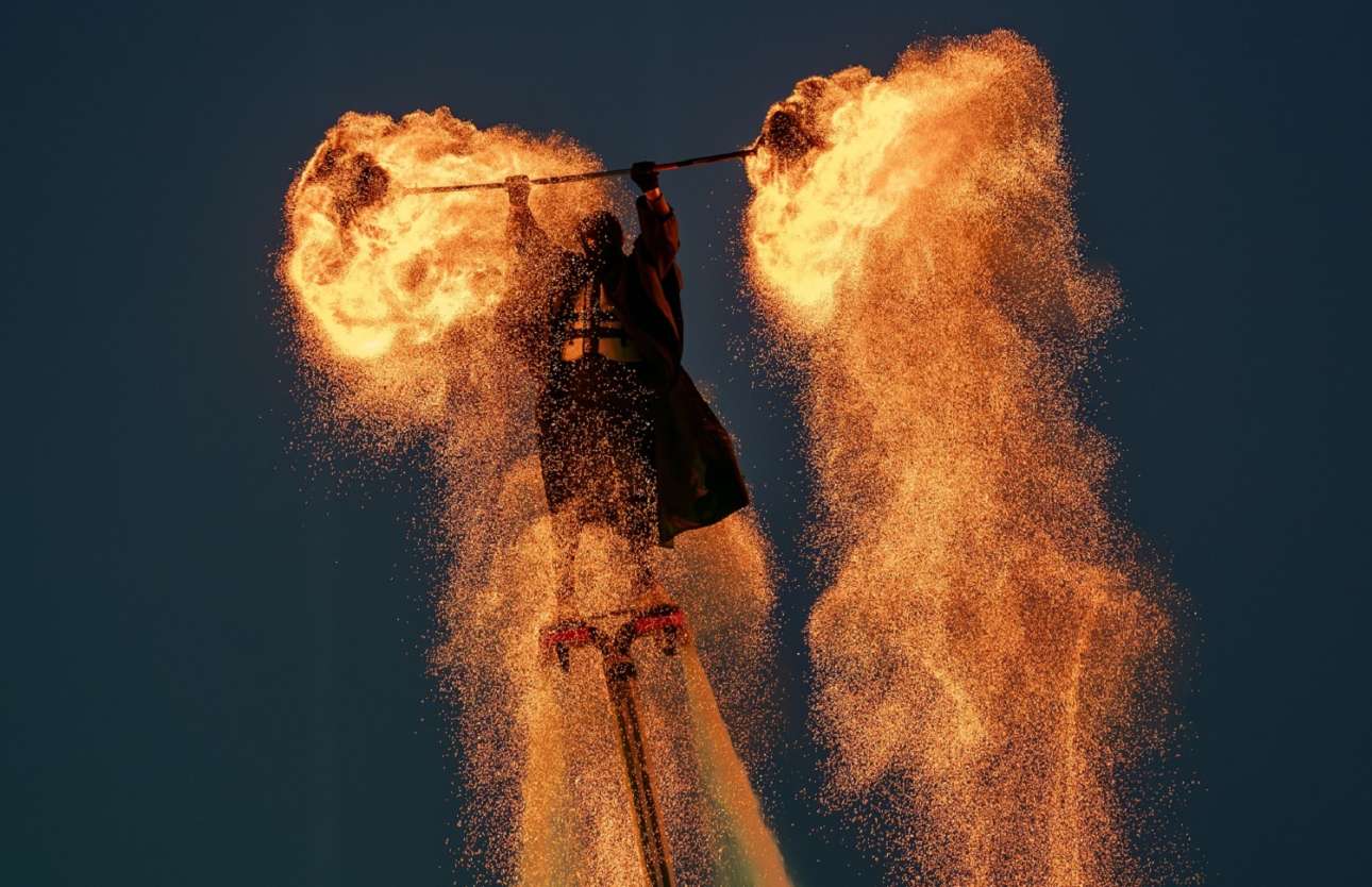 «Φλεγόμενος» λαϊκός καλλιτέχνης υπερίπταται με τη βοήθεια συσκευής πρόωσης καθ’ ύψος – καρέ από τα πανηγύρια που στήνουν οι Κινέζοι με αφορμή το νέο έτος τους