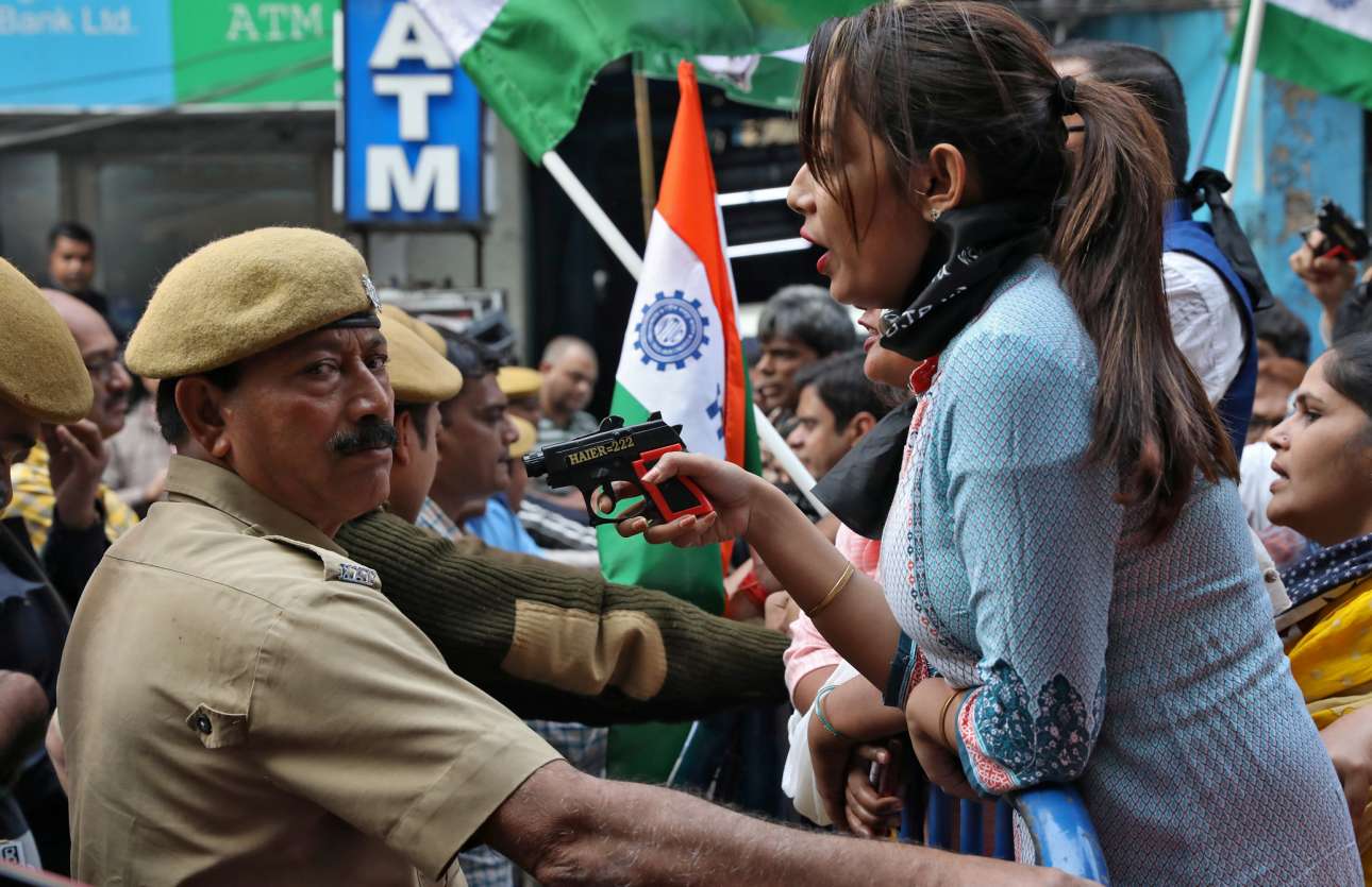 Ινδία: η διαδηλώτρια παίζει με το ψεύτικο πιστολάκι της και ο χωροφύλακας με δυσκολία κρύβει την ενόχλησή του – γραφικότητες από διαδήλωση στην Καλκούτα
