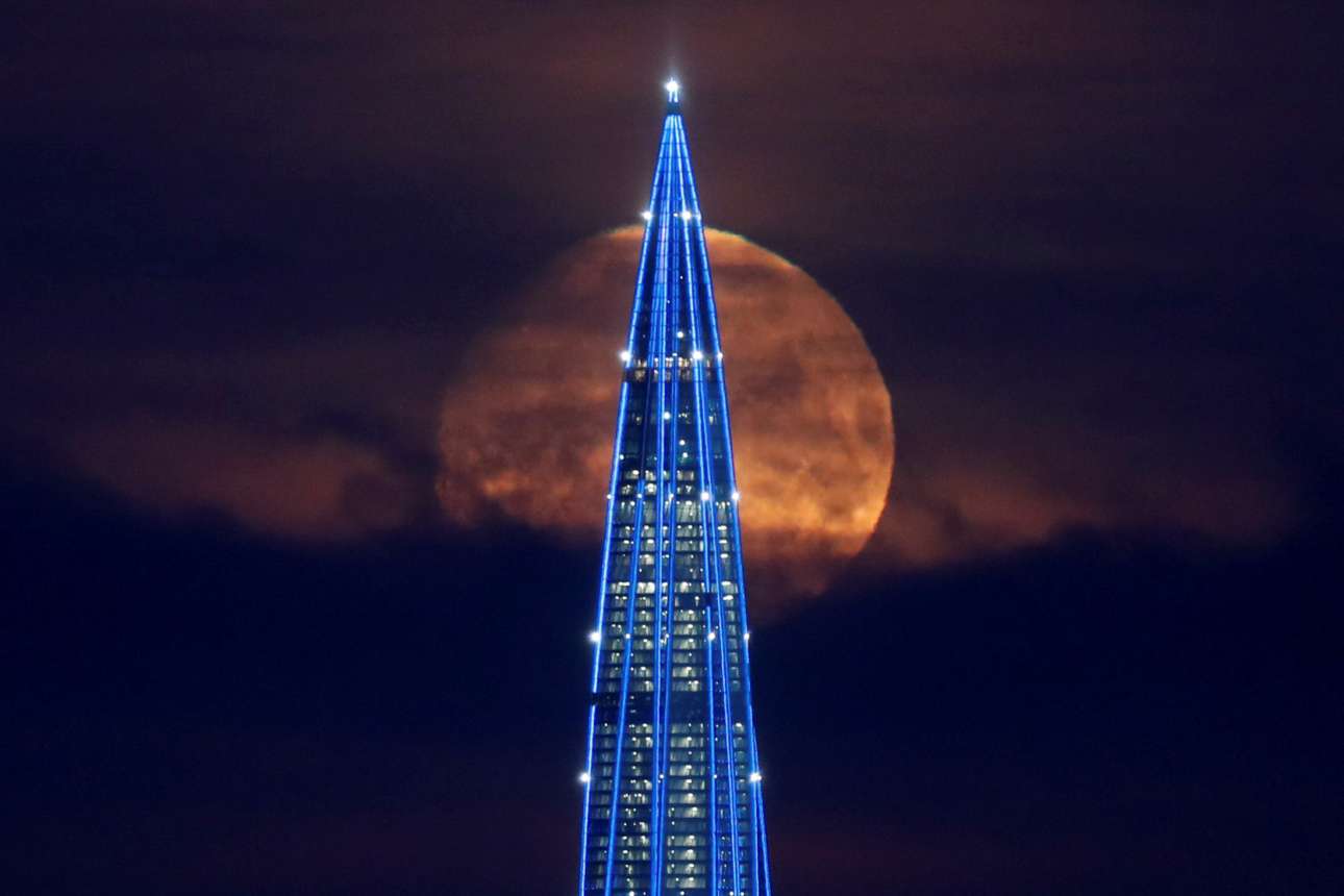 Ρωσία: το φεγγάρι προβάλλει πίσω από τον πύργο Lakhta Center, στην Αγία Πετρούπολη, ο οποίος, όταν θα ολοκληρωθεί η κατασκευή του, θα στεγάζει επιχειρήσεις