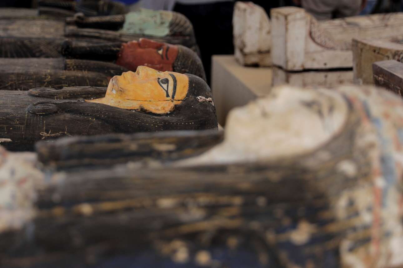 Καρέ από την παρουσίαση των αιγυπτιακών σαρκοφάγων και κτερισμάτων που ξεθάφτηκαν στη Νεκρόπολη Σακάρα, στα νοτιοδυτικά του Καΐρου – είναι αθάνατα κιβούρια και ειδώλια, ηλικίας 2.500 ετών, χωρίς όμως τα ποιητικά κατευόδια των ελληνιστικών «Φαγιούμ» και τα εκπληκτικά βλέμματά τους
